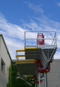 Hareketli Cephe Platformlaımız r Hafif, Orta ve Ağır Tip olmak üzere 3 ayrı masta göre farklı genişlik ve yük kapasitesindedir. Elektromanyatik frenli motor veya motorların tahrik ettiği pinyon dişlinin masta tutturulmuş krameyer dişli üzerinde yükselmesi ile çalışır.Redüktör çıkışı uzun mast ömrü ve yumuşak duruş için avare dişli üzerinden krameyere basar.